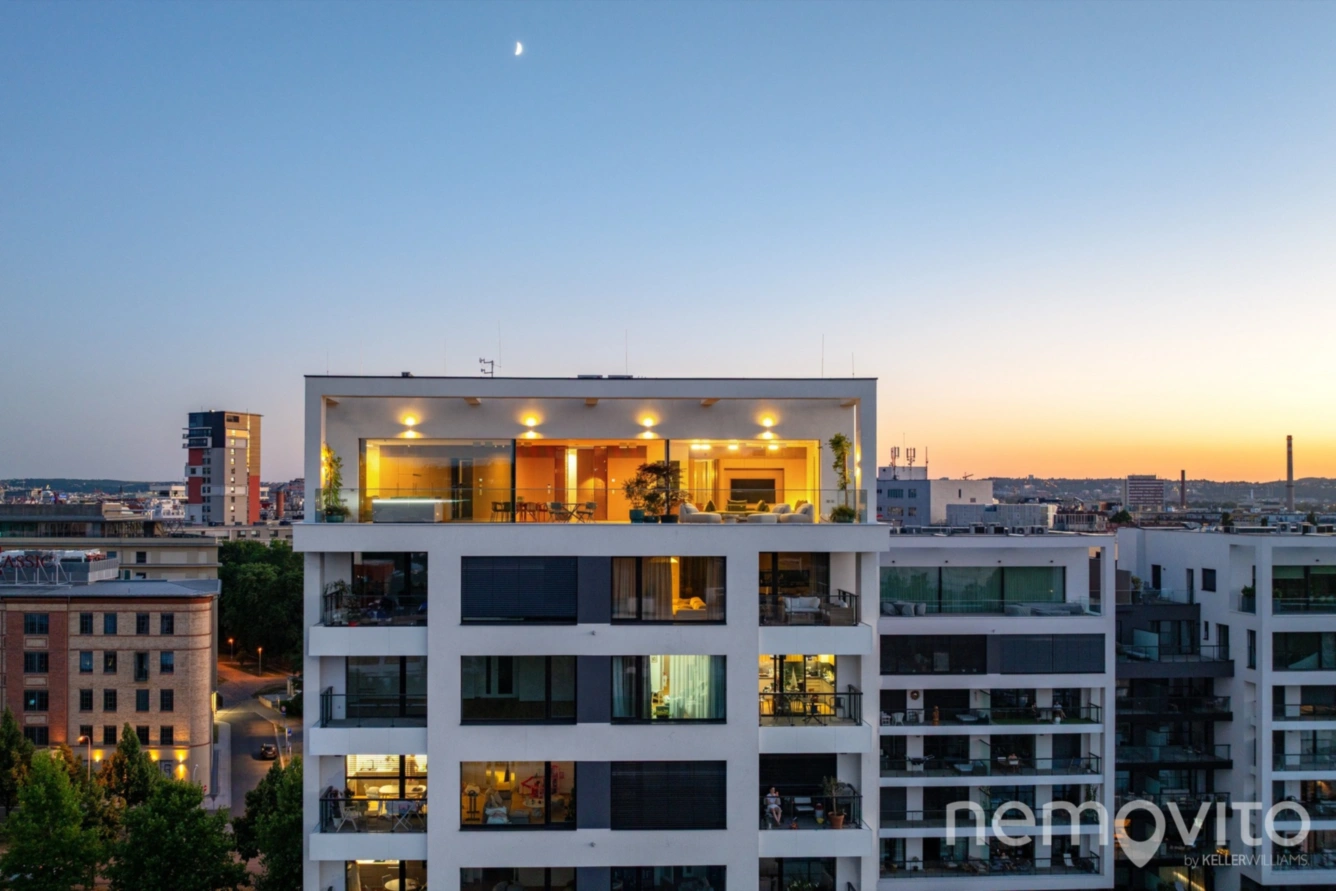 Fully furnished and freshly built penthouse with an area of over 250 sqm, offering unique panoramic views from the top floor of the Prague Marina Nova building. The apartment includes a 74 sqm terrace, two balconies, two storage rooms, two separate garages and two garage parking spaces. The apartment is air-conditioned, equipped with underfloor heating, recuperation and represents the pinnacle of current Czech housing construction.