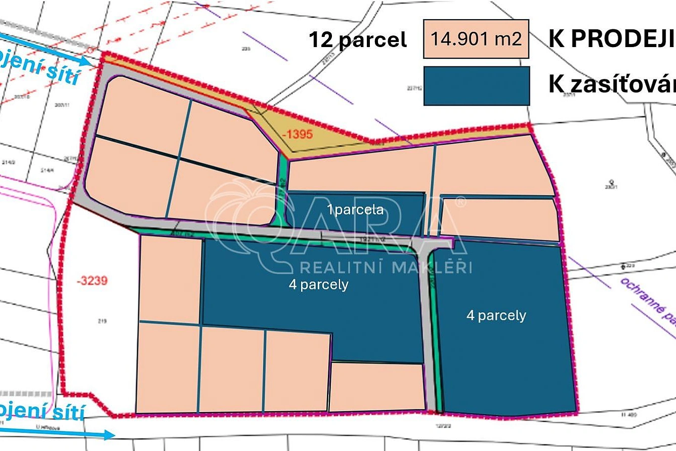 Soubor 12-ti stavebních pozemků (Pouze jako celek) o celkové ploše 14 901m2 s podílem na přilehlých komunikacích připravený k zasíťování a výstavbě rodinných domů.