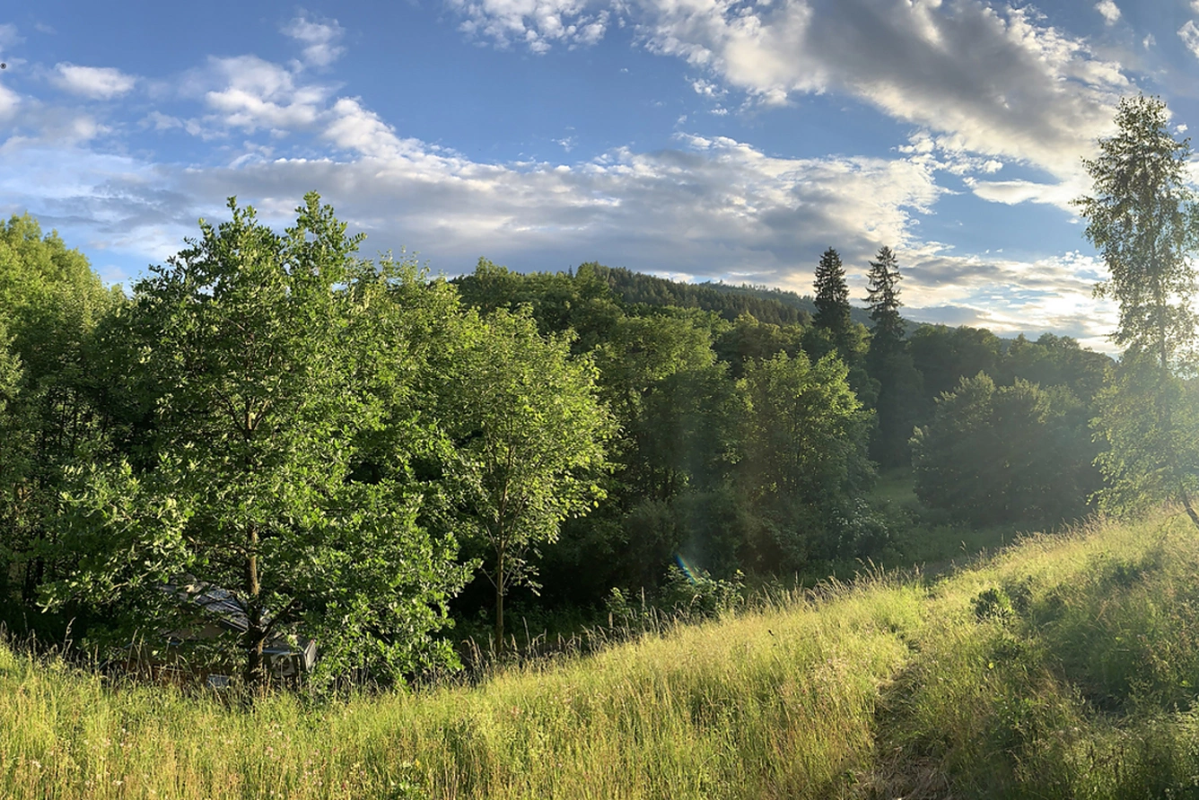 Pozemek je situován na slunném, jižně orientovaném svahu na úpatí Svatoboru, což zajišťuje dostatek světla po celý den a zároveň krásné výhledy do okolní krajiny, dokonce i na hrad Kašperk. Výhodou je také dostupnost řeky a oblíbené lokality Páteček.
