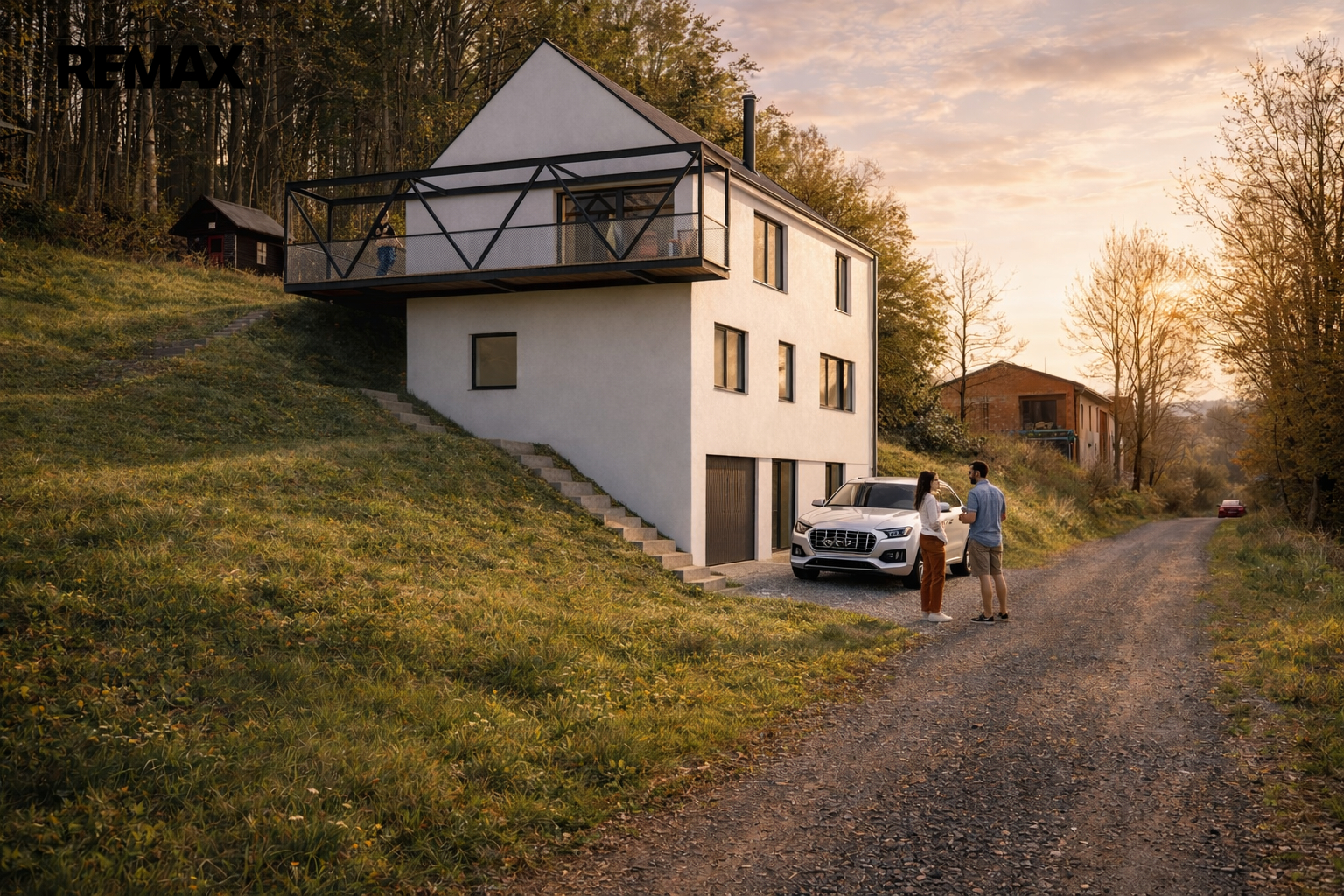 Navržený dům citlivě reaguje na terén – obytný prostor v podkroví přirozeně navazuje na svažitý pozemek, což umožňuje přímý vstup na zahradu a dále do lesa. Ideální řešení pro ty, kteří chtějí žít v kontaktu s přírodou.