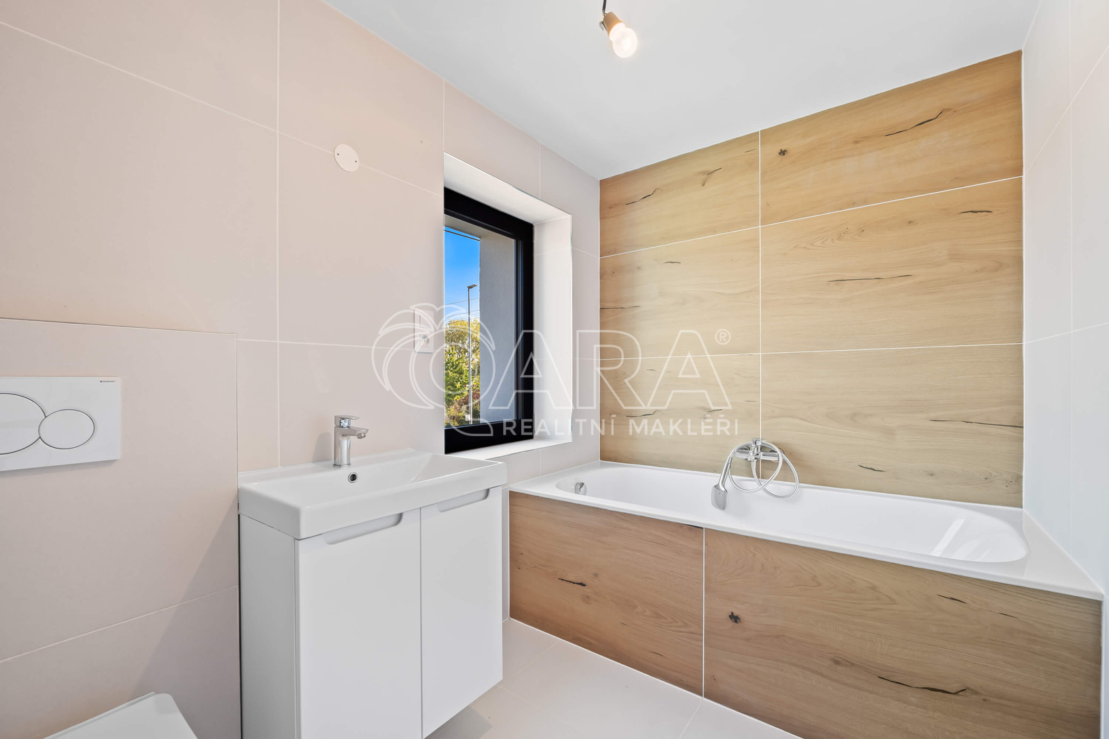 Na podlahách byla položena vinylová podlaha v kombinaci s dlažbou a byly dodány veškeré zařizovací předměty do koupelen a na WC, dále pak dveře včetně obložek. Jinak je dům nevybaven.