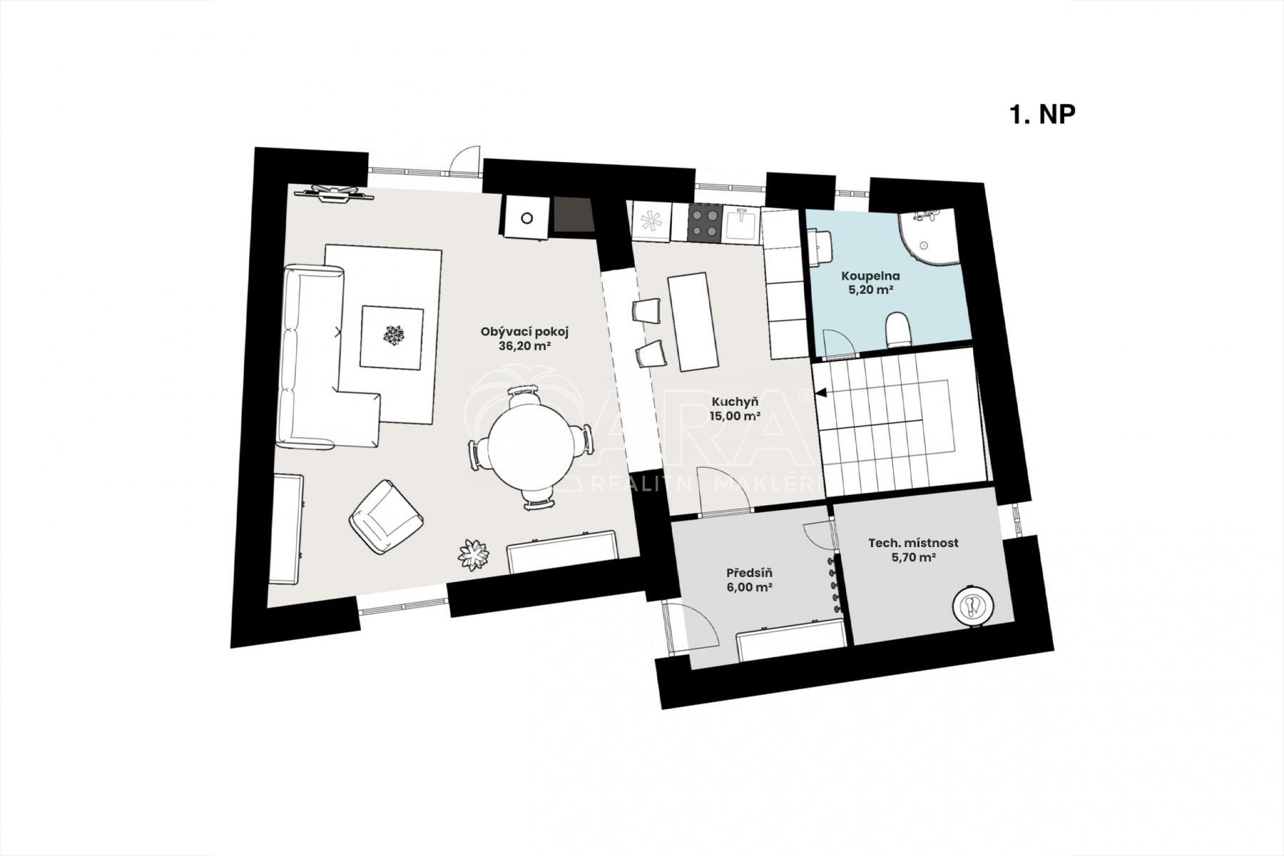 Dispozice: 1. NP - zádveří, prostorný obývací pokoj s krbem, kuchyňským a jídelním koutem (50,2 m2) a vstupem na zahrádku, koupelna se sprchovým koutem a WC, technická místnost