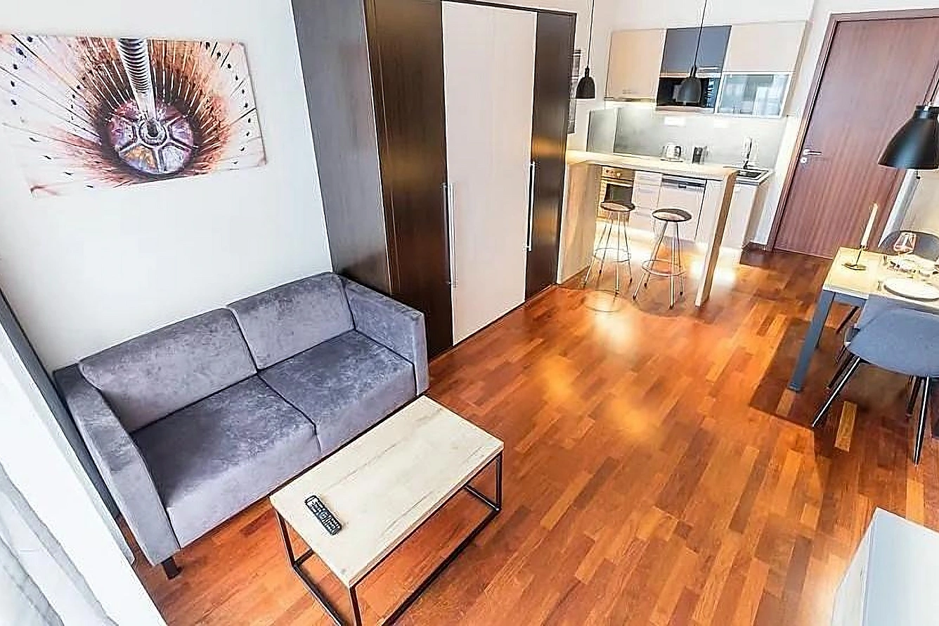 Byt je plně vybaven moderním nábytkem, kuchyňskou linkou včetně veškerého vybavení (nádobí, příbory, kávovar atd.), televizí se satelitním příjmem a vysokorychlostním internetem, který je již zahrnut v ceně nájmu.
