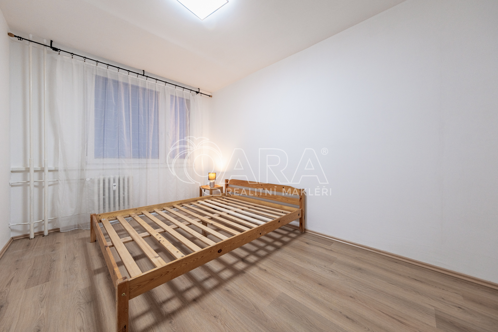 Z prostorné předsíně se vchází do všech místností v bytě. Koupelna je spojena s toaletou, vybavená je vanou a umyvadlem, zrcadlovou skříňkou, pračka k dispozici. Ložnice (12 m2) je vybavena postelí 160 x 200 cm a nočním stolkem.