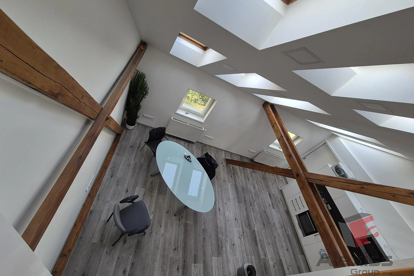 - Přiznané dřevěné trámy dodávají prostoru jedinečný charakter