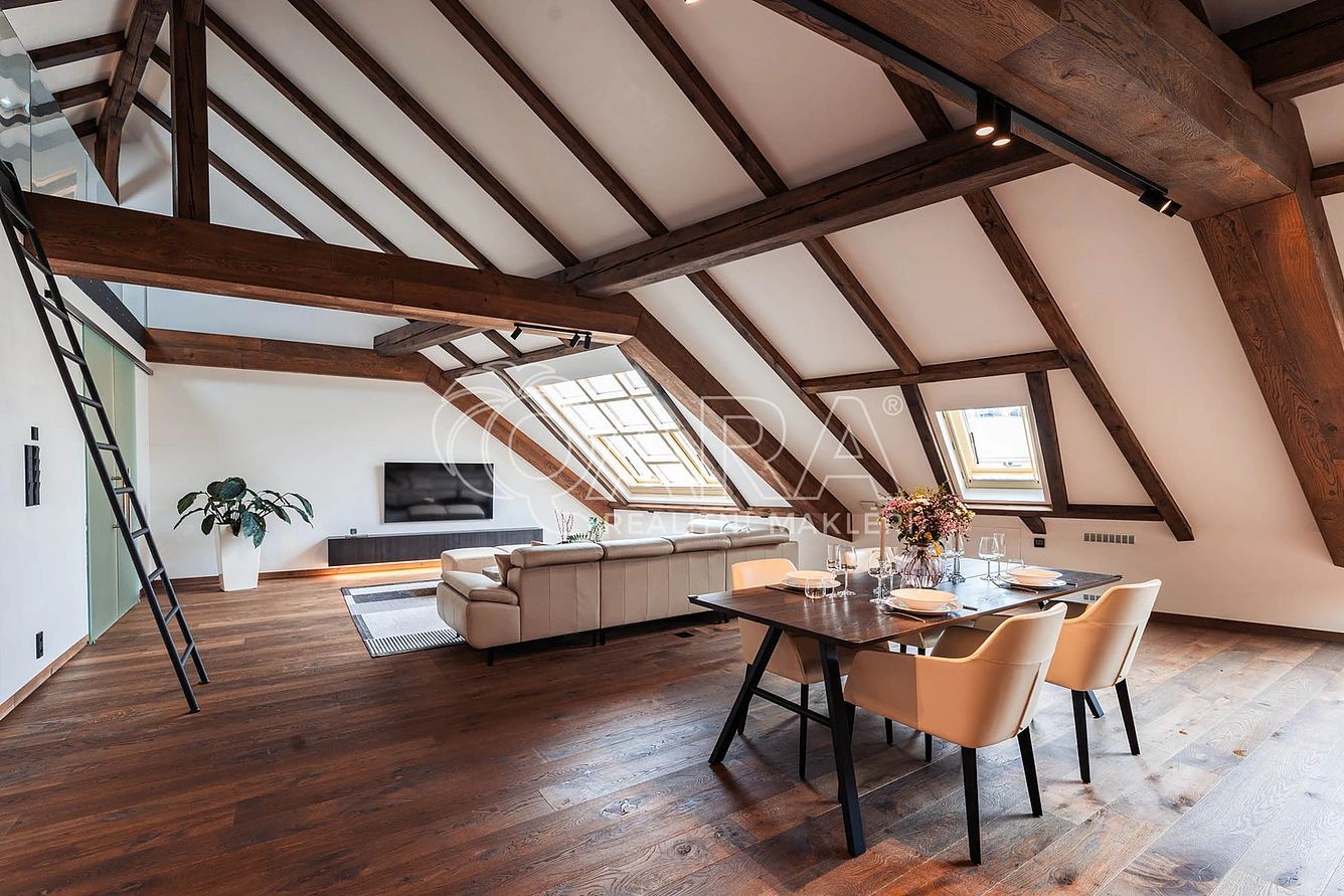 V celém bytě jsou dřevěné podlahy, vysoké stropy a nadstandardní množství vestavěných úložných prostor. Komfort zajišťuje stropní sálavé vytápění a chlazení, systém nucené výměny vzduchu, inteligentní ovládání domácnosti Loxone a vysokorychlostní optický internet.