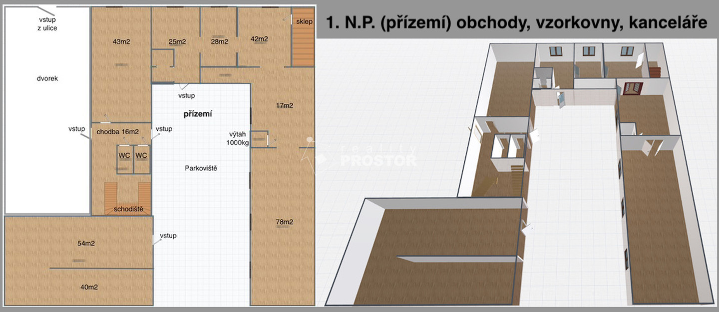 Přízemí tvoří pět prostor o celkové ploše 350 m² vhodných pro prezentaci výrobků nebo přímý prodej. V patře najdete 7 kanceláří s kuchyňkou a WC o celkové ploše 281 m² s velkou vzorkovnu 70 m² pro setkávání s klienty či prezentaci výrobků. Sklep je před rekonstrukcí nabízí dalších 80 m² pro rozšíření provozu a není započítám do plochy pronájmu.Vstup do kanceláří i vzorkovny je možný z ulice i ze zadního dvora, kde je k dispozici parkování pro zaměstnance i návštěvy. Objekt umožňuje kombinaci administrativy a prezentace výrobků na jednom místě a nabízí možnost pronájmu dalších skladových prostor podle potřeby.Tyto prostory jsou ideální pro firmy, které chtějí kanceláře a vzorkové prodejny pohromadě, s přímým kontaktem s klienty a možností rozšíření provozu dle aktuálních potřeb.Budova je zateplená, průkaz energetické náročnosti zatím nebyl vydán, proto je administrativně uvedena jako třída G, což neodráží skutečnou spotřebu energie.K objektu náleží parkování přímo u budovy a výborná dopravní dostupnost – snadné napojení na dálnici D11 a Pražský okruh, dobrá dostupnost do centra Prahy i do průmyslových zón v okolí, zastávka MHD přímo před budovou (směr Černý Most, Brandýs nad Labem, Úvaly a další směry).Pro více informací a domluvení prohlídky nás kontaktujte.